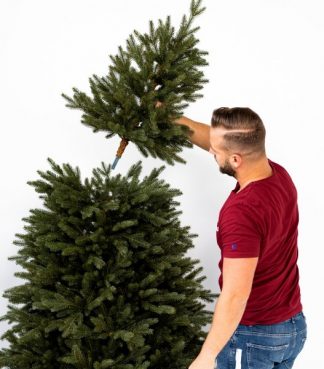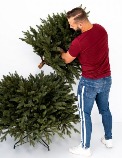 Eine ungeschriebene Regel besagt, dass nur eine Person den Weihnachtsbaum zur gewünschten Form ausrichten sollte. Dadurch wird sichergestellt, dass der Christbaum von allen Seiten gleich aussieht. Beginnen Sie die Zweige vom Stamm aus bis hin zu den Astspitzen zurechtzubiegen. Achten Sie darauf, dass die Zweige in verschiedene Richtungen aufgespreizt werden, wodurch der Weihnachtsbaum an Volumen gewinnt. Bei einigen Weihnachtsbaum-Modellen sind die Zweige bereits in der gewünschten Richtung positioniert. Sie müssen nur noch aufgespreizt werden. Richten Sie die Astspitzen immer sternförmig aus, wodurch die perfekte Form und das perfekte Aussehen Ihres Weihnachtsbaums gewährleistet wird.
