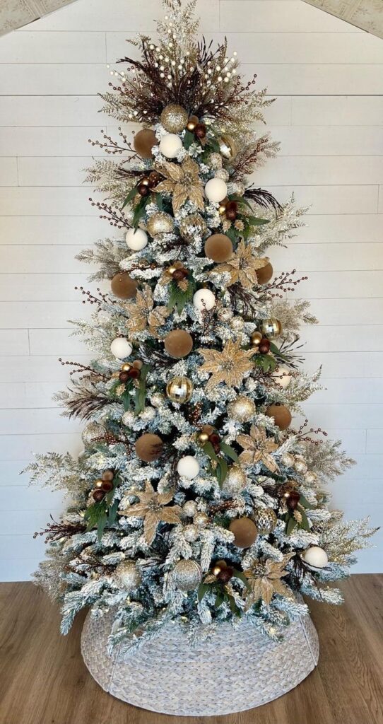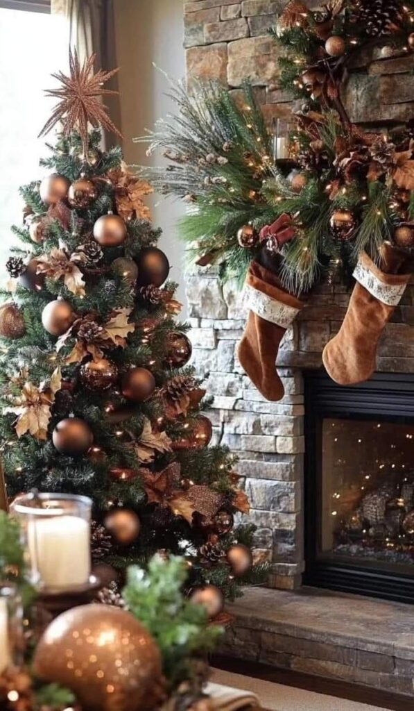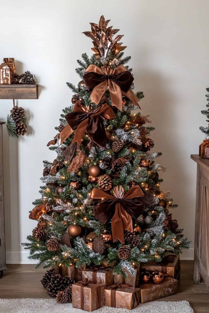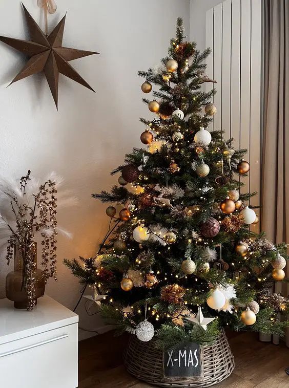 Ein festlicher Weihnachtsbaum, der wie aus einem Magazin aussieht? Mit Mocha Mousse und goldenen oder kupferfarbenen Akzenten gelingt dieser Look mühelos. Kombinieren Sie glänzende Weihnachtskugeln, Satinbänder und Kristall-Elemente für einen exklusiven Effekt.