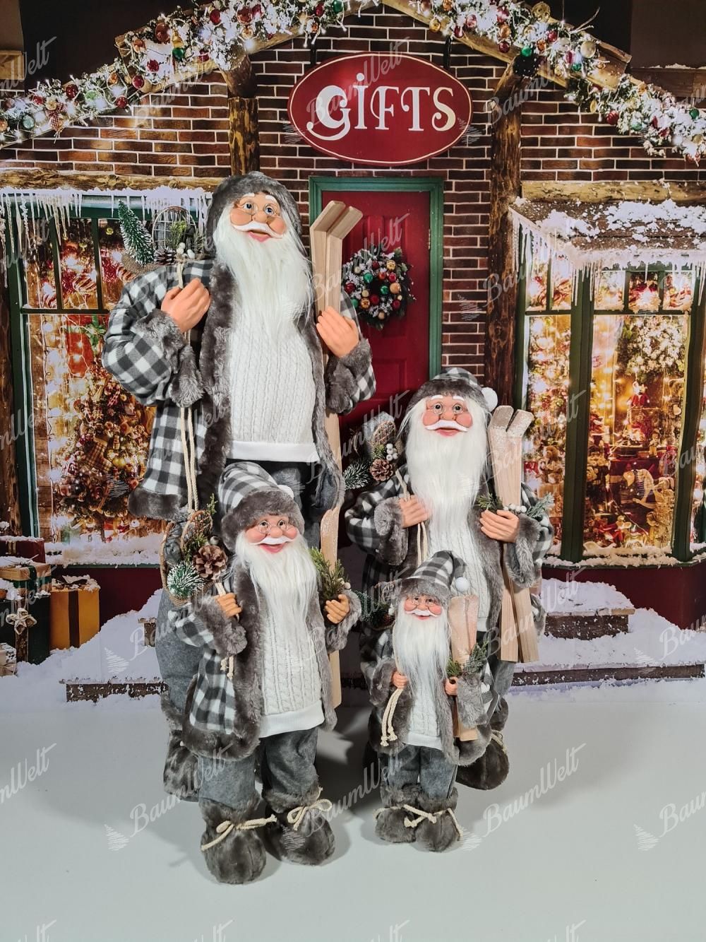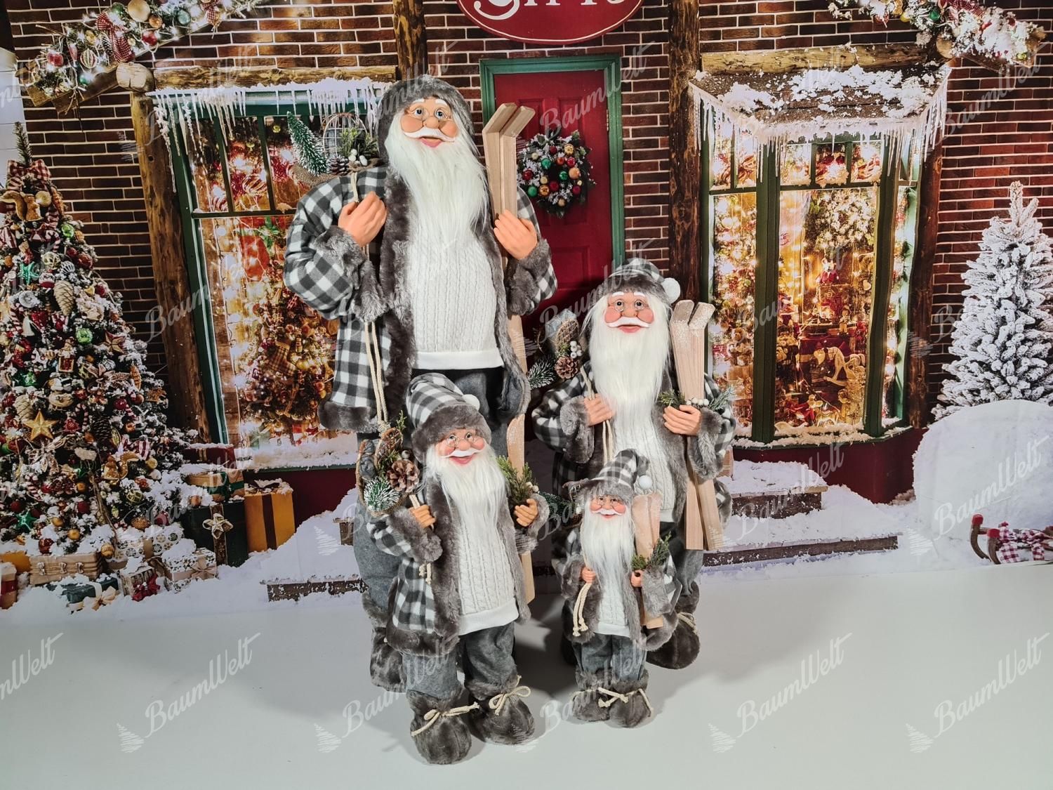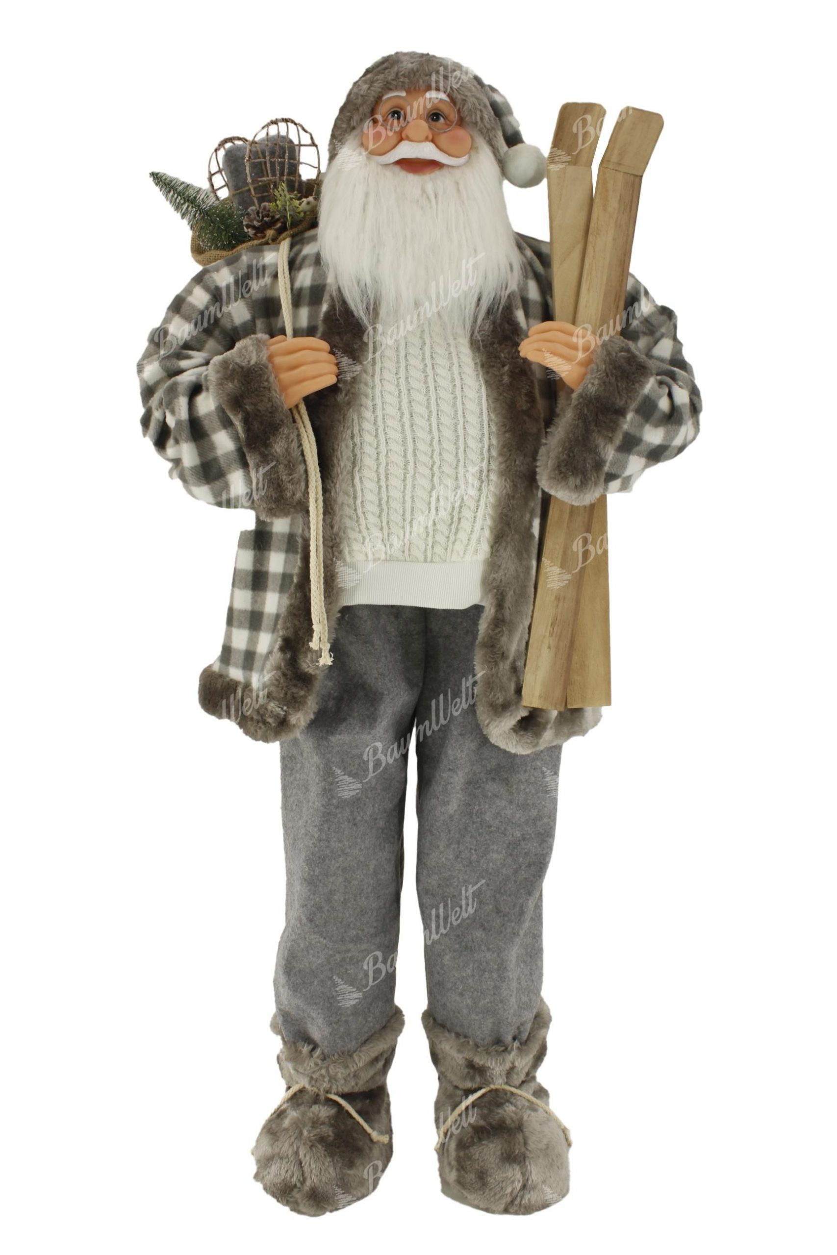 Der graue Santa Claus ist detailliert verarbeitet. Sein realistisches Gesicht ist mit einer runden Brille und einem dicken weißen Kinn verziert. In seinen Händen hält er stilvoll Geschenke, Zweige oder Ski.