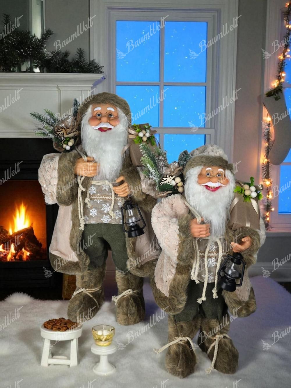 Der Weihnachtsmann in creme ist detailliert verarbeitet. Sein realistisches Gesicht ist mit einer runden Brille und einem dicken weißen Kinn verziert. In seinen Händen hält er stilvoll einen Sack mit Geschenken, Zweige oder eine Laterne.