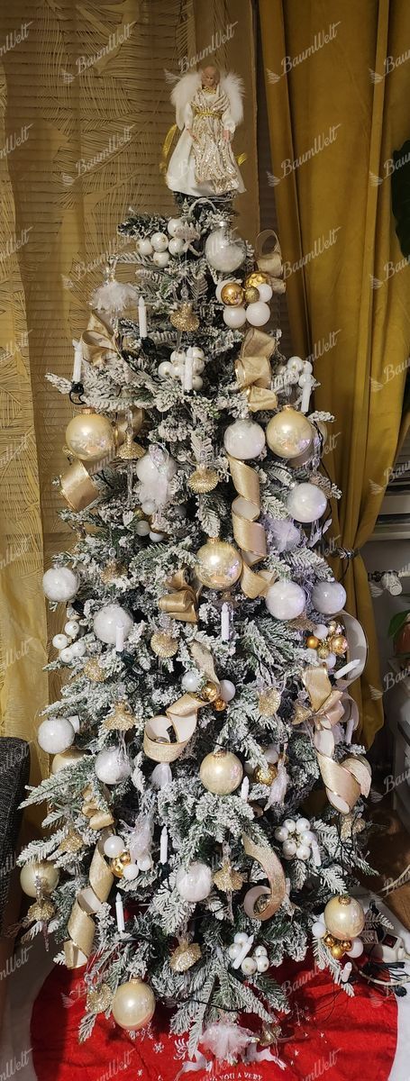 Die Neuigkeit für die Saison 2024 ist der 3D-Weiß-Tanne-Weihnachtsbaum, der mit seinen dicht verschneiten Tannenzweigen originell ist. Das realistische verschneite Aussehen des Baumes schafft eine magische, verschneite Atmosphäre in Ihrem Zuhause und sein schmales Design macht ihn ideal für kleinere Räume.