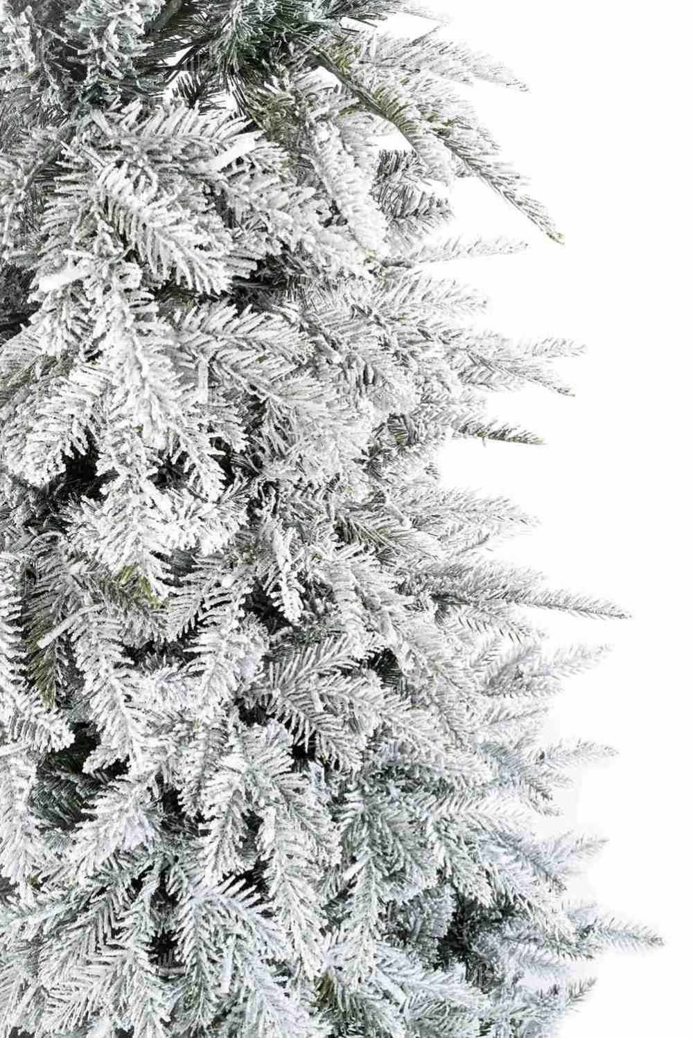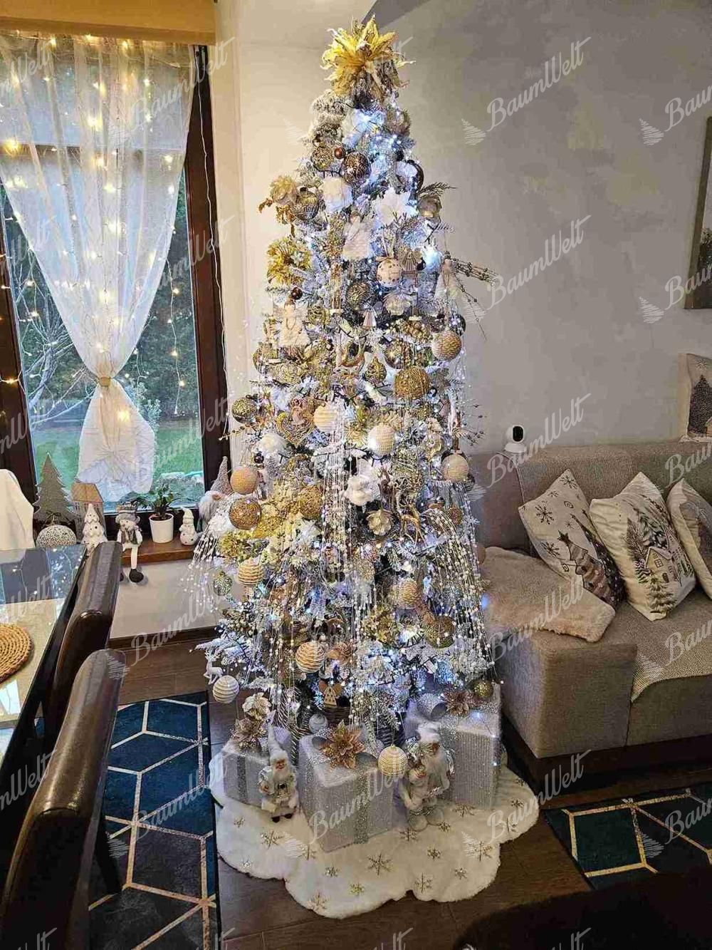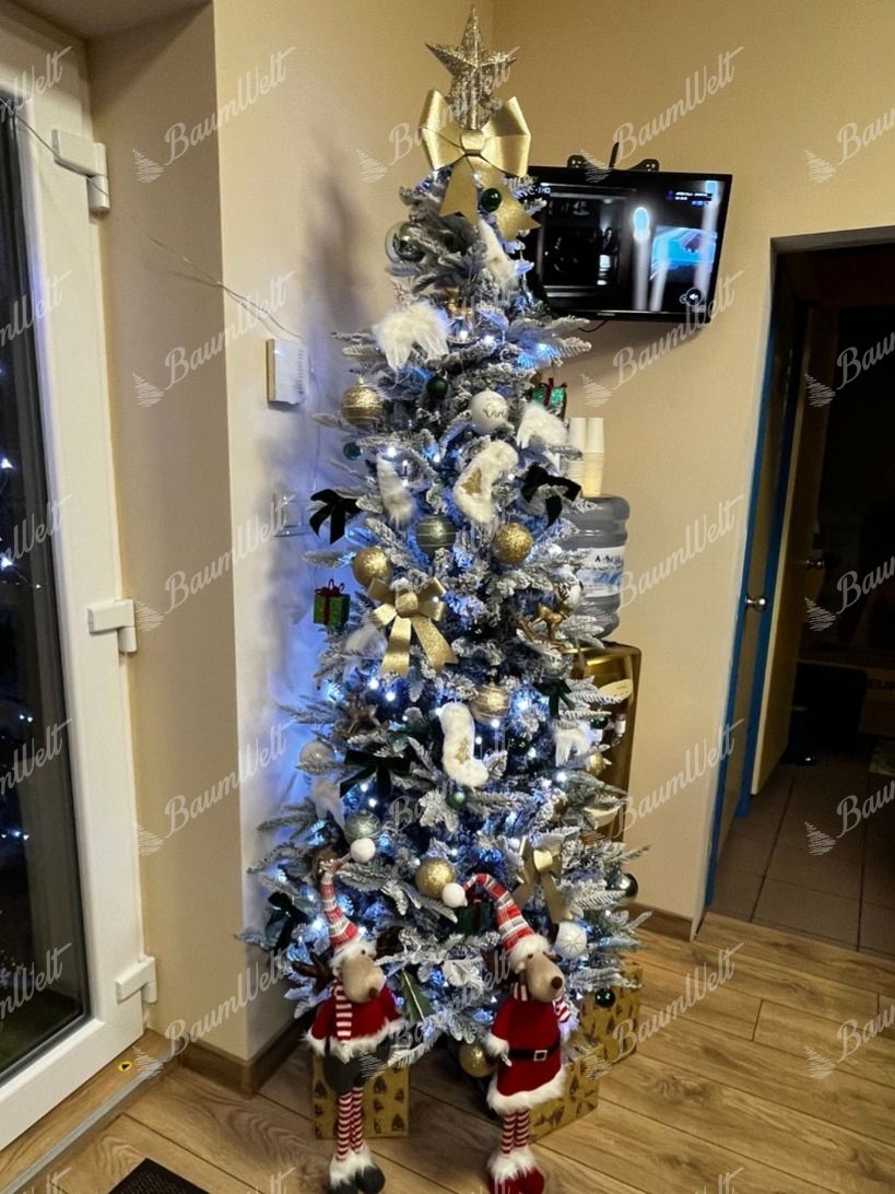 Die Neuigkeit für die Saison 2024 ist der 3D-Weiß-Tanne-Weihnachtsbaum, der mit seinen dicht verschneiten Tannenzweigen originell ist. Das realistische verschneite Aussehen des Baumes schafft eine magische, verschneite Atmosphäre in Ihrem Zuhause und sein schmales Design macht ihn ideal für kleinere Räume.