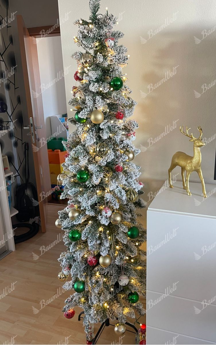 Der Kunstschnee wird mit modernster Technologie aufgebracht und fällt nicht ab. Wenn der Baum zum ersten Mal aufgeklappt wird, können nicht eingefangene Teile des Schnees freigesetzt werden. Der Baum hat ein ausziehbares Faltsystem, eine Metallkonstruktion und einen stabilen Metallständer, der im Lieferumfang enthalten ist.