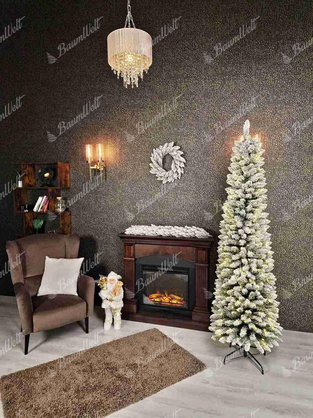 Die Neuigkeit für die Saison 2024: Der moderne, schneebedeckte Baum in der schmalen Version Weiß-Fichte Schmal zaubert dank der PVC-Fichtenzweige, die dicht mit realistischem Kunstschnee bedeckt sind, eine unvergessliche Schneestimmung.