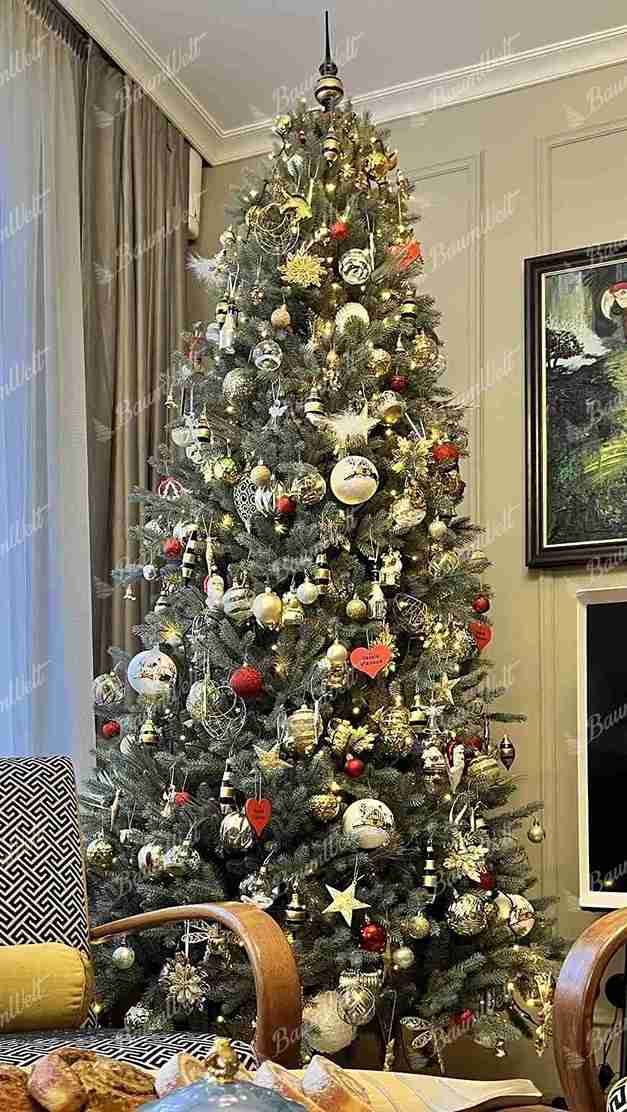 - der Baum wird in der Mitte durch klassische grüne PVC-Zweige ergänzt, wodurch ein dichtes Erscheinungsbild erreicht wird