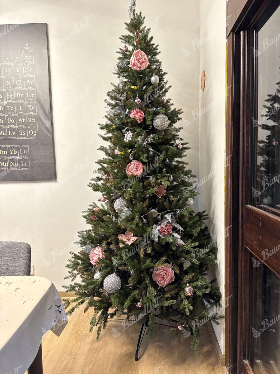 - der Baum wird in der Mitte durch klassische grüne PVC-Zweige ergänzt, wodurch ein dichtes Erscheinungsbild erreicht wird