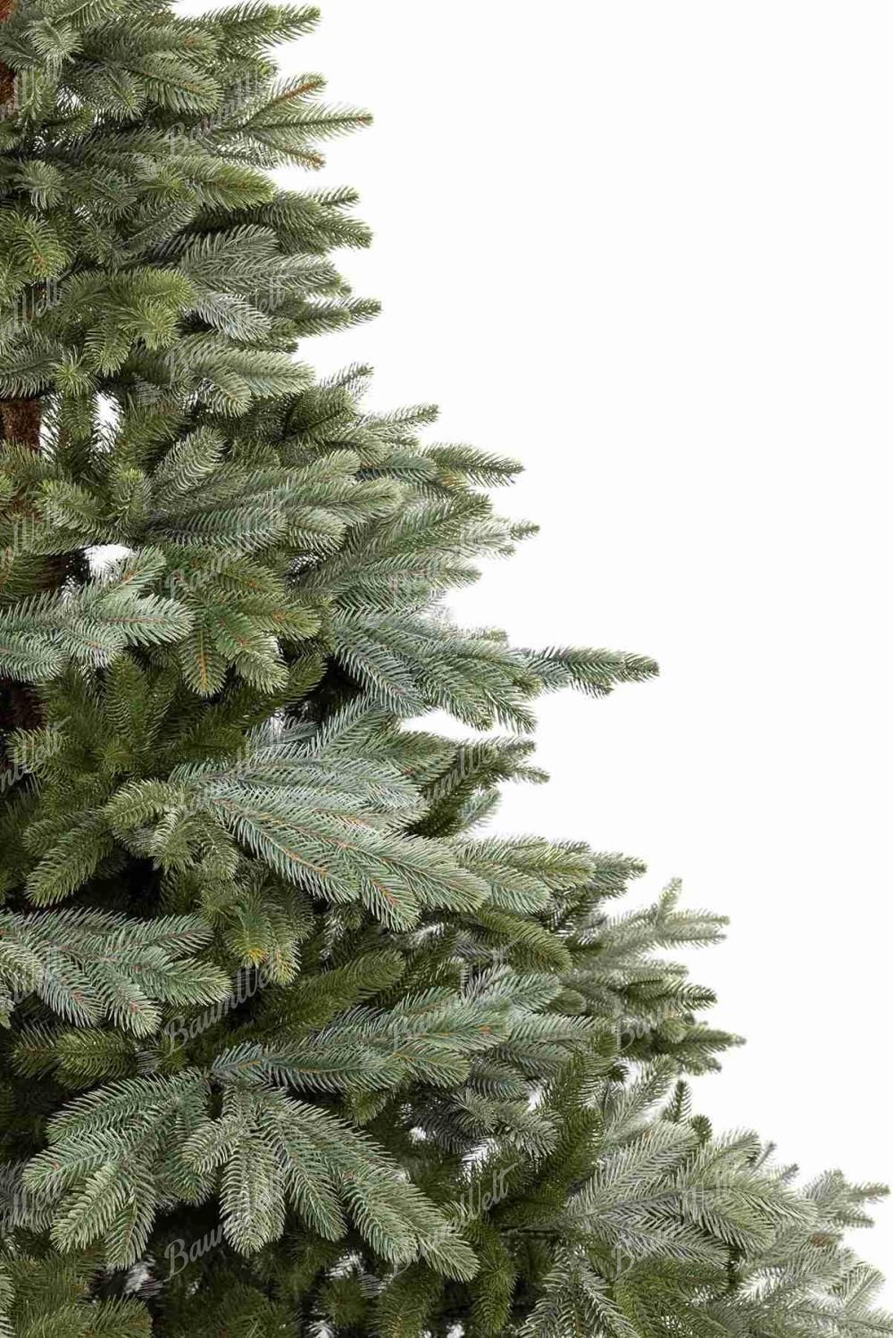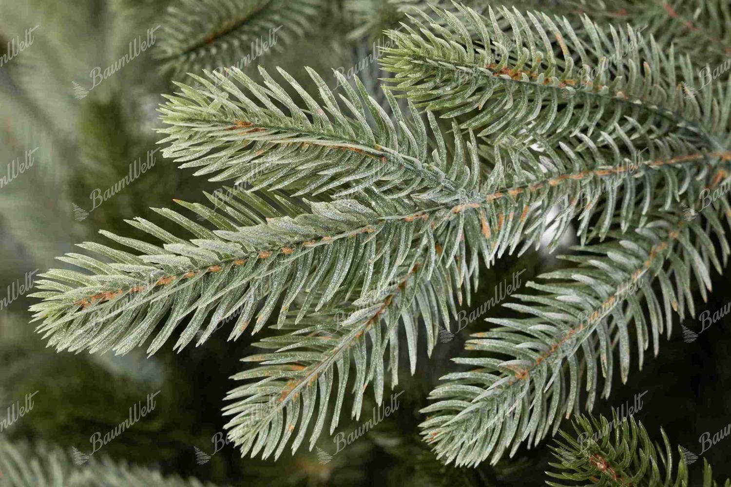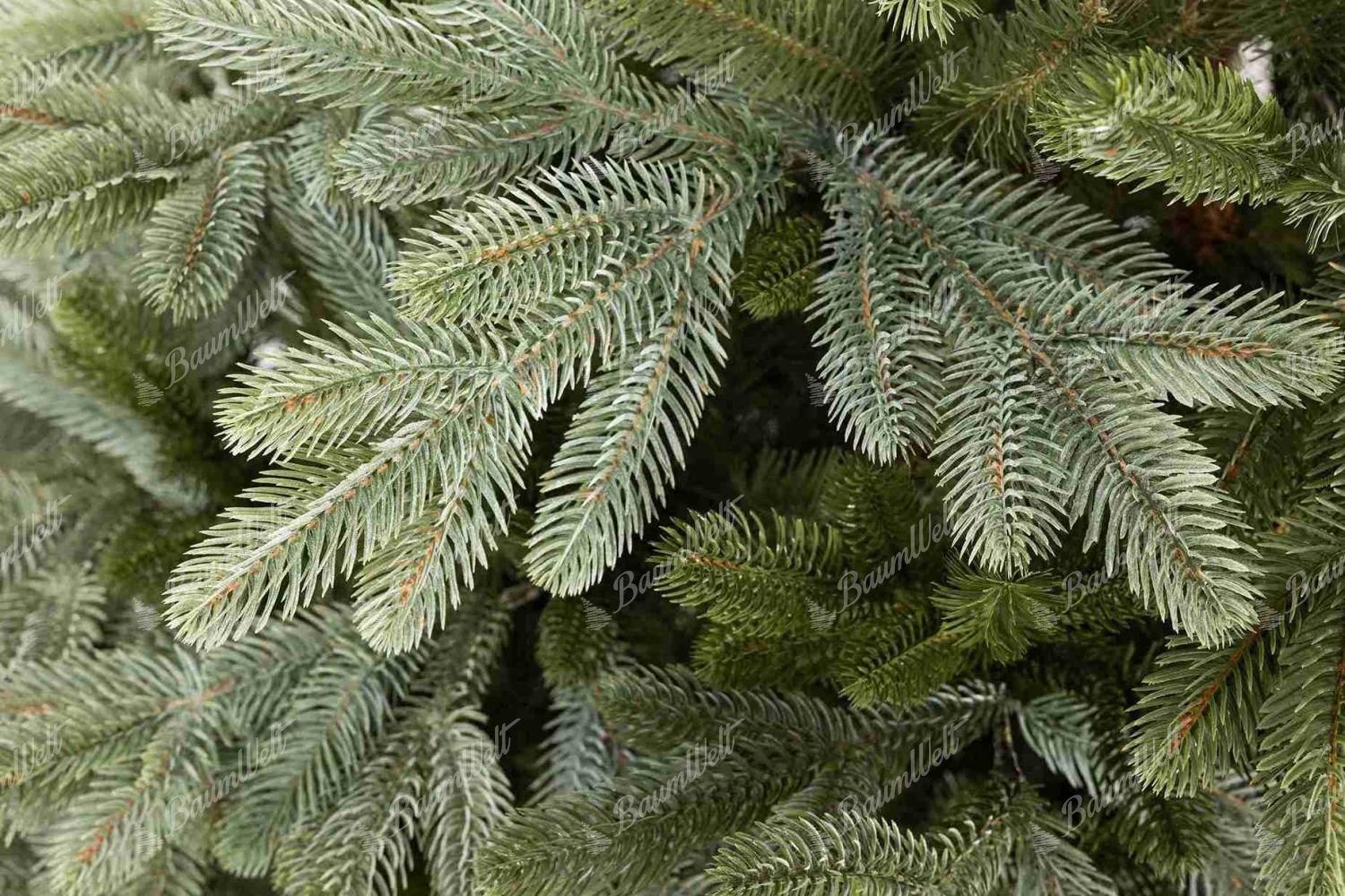 Einzigartige zweifarbige Nadeln – dunkelgrün in der Tiefe des Baumes und silbrig an den Zweigspitzen – erzeugen einen beeindruckenden Kontrast, der einen zarten Schneeeffekt hervorruft. Dieses feine Detail verleiht dem Baum einen eleganten und frischen Wintercharakter.