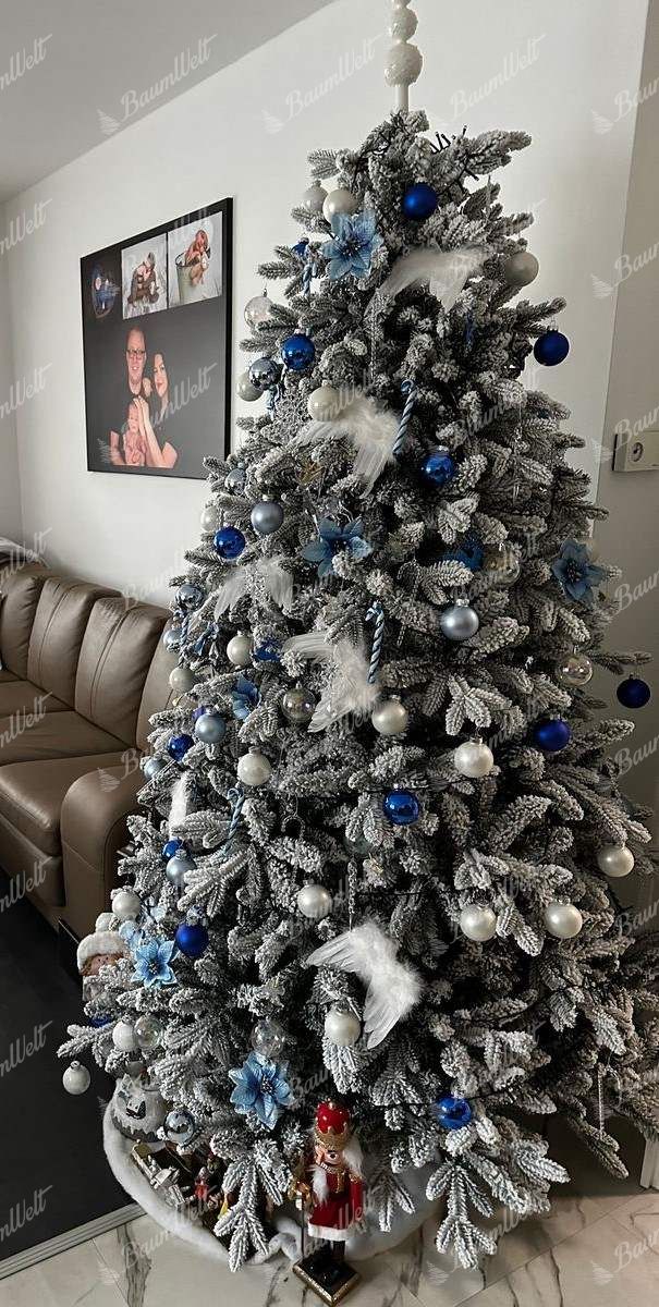 Die 3D-Nadeln um den gesamten Umfang des Baumes werden durch klassische PVC-Nadeln ergänzt, die dicht beschneit sind. Die moderne Applikation von einem Kunstschnee auf den Baum garantiert, dass der künstliche Schnee nicht abfällt. Der Baum besteht aus einer festen Eisenkonstruktion und ein stabiler Metallständer ist Bestandteil der Verpackung.