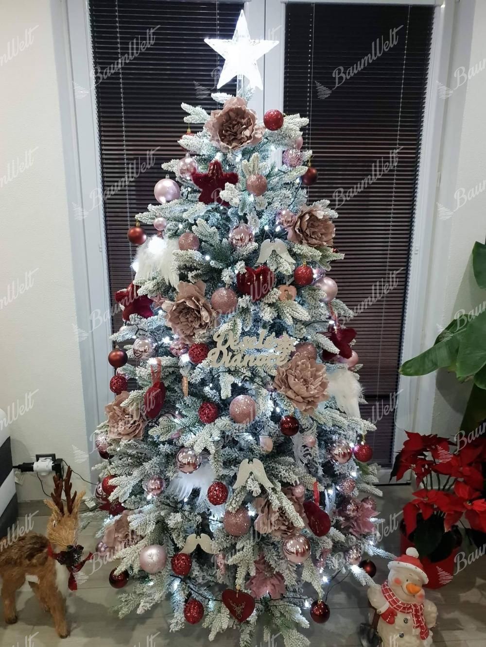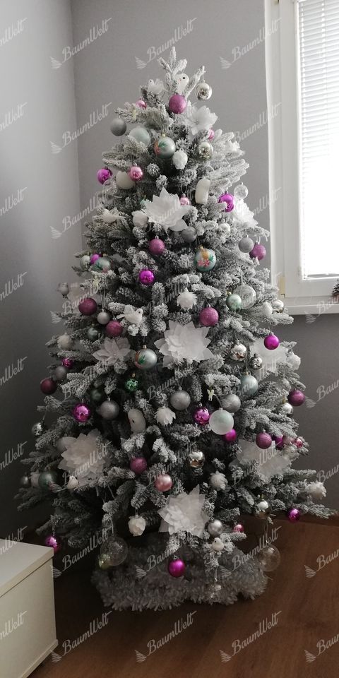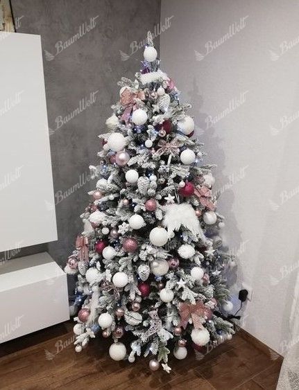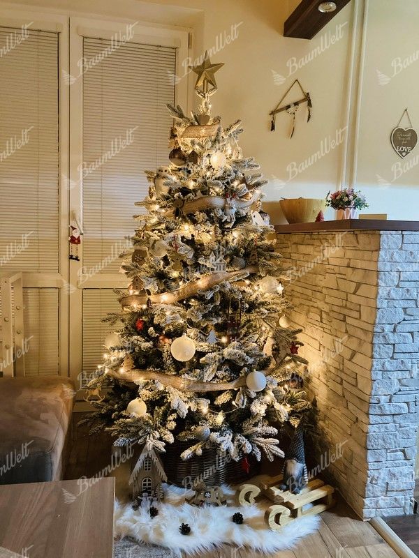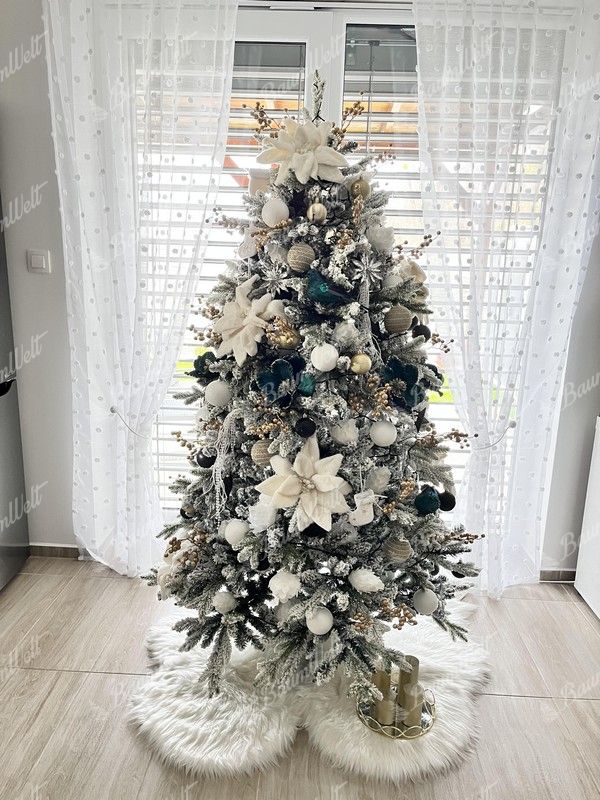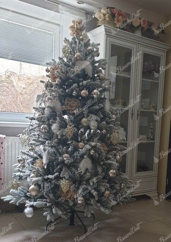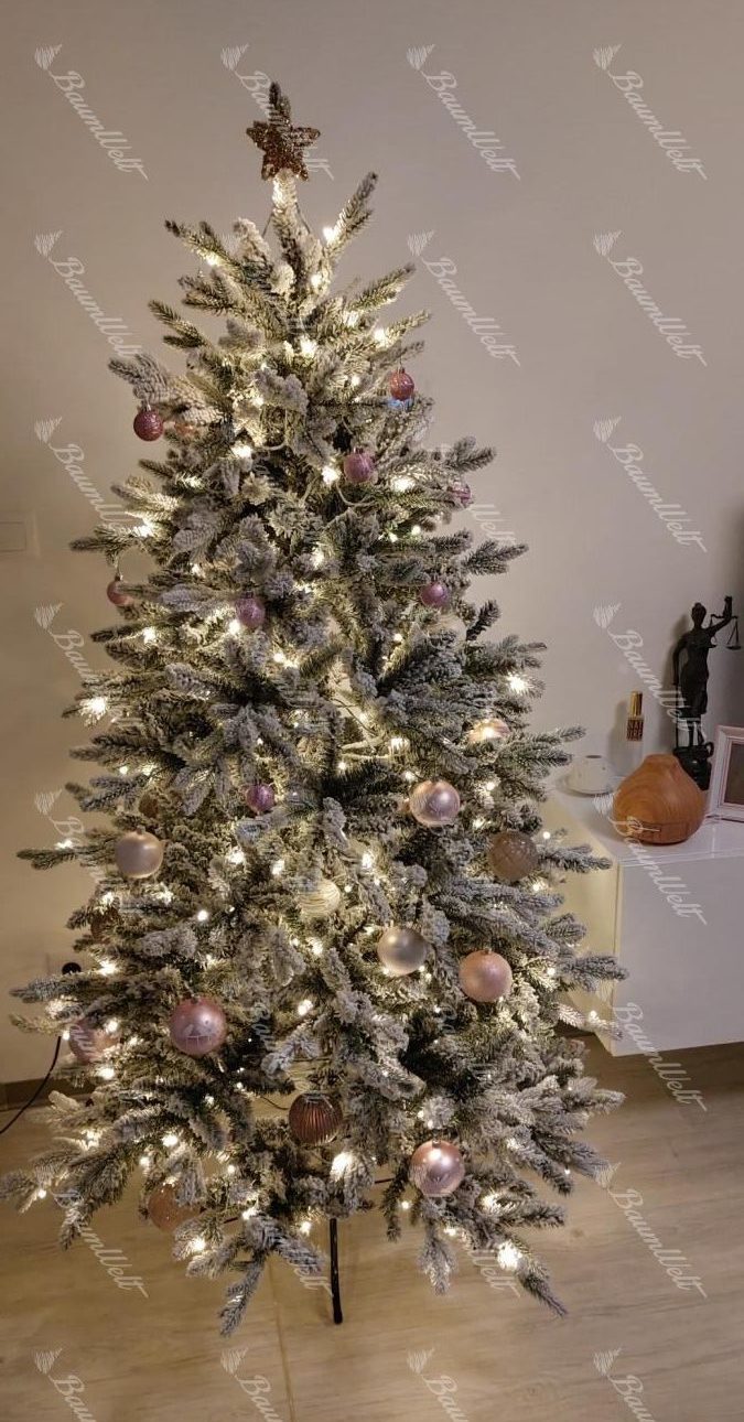 Die 3D-Zweige werden durch klassische PVC-Zweige, die mit Kunstschnee beschneit sind, ergänzt, wodurch der Baum dichter wirkt. Das neueste Anwendungssystem garantiert, dass kein Kunstschnee von den Bäumen fällt. Der Baum besteht aus einer festen, stabilen Eisenkonstruktion und wird mit einem Metallständer geliefert. Für die perfekte Form des Baumes sorgt ein Regenschirm-Faltsystem, das die einzelnen Zweige an eine vorbestimmte Stelle platziert.