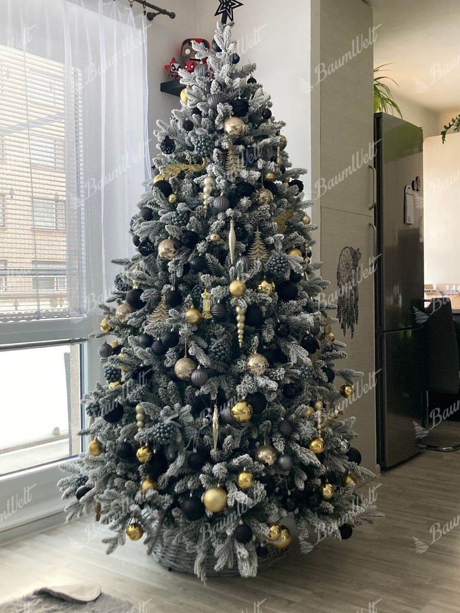 Die 3D-Zweige werden durch klassische PVC-Zweige, die mit Kunstschnee beschneit sind, ergänzt, wodurch der Baum dichter wirkt. Das neueste Anwendungssystem garantiert, dass kein Kunstschnee von den Bäumen fällt. Der Baum besteht aus einer festen, stabilen Eisenkonstruktion und wird mit einem Metallständer geliefert. Für die perfekte Form des Baumes sorgt ein Regenschirm-Faltsystem, das die einzelnen Zweige an eine vorbestimmte Stelle platziert.