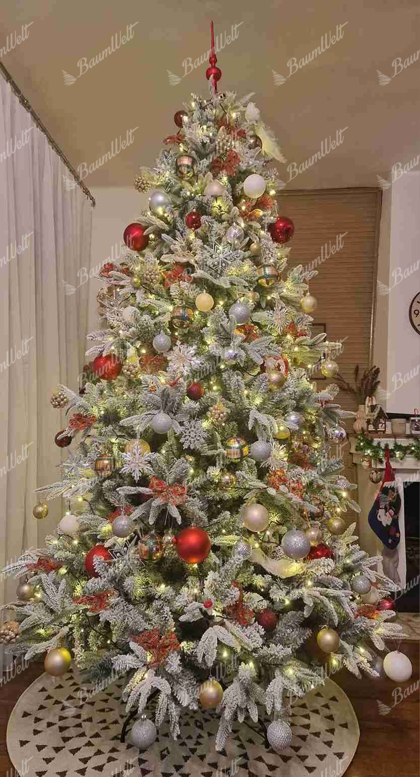 Mit Hilfe neuester Technologien werden nach und nach Kunstschneeschichten, die nicht vom Baum fallen, auf den gesamten Baum aufgetragen. Die Mitte des Baumes besteht aus dunkelgrünen Nadeln, während die Zweigenden dicht beschneit sind. Für die perfekte Form des Baumes sorgt ein Regenschirm-Faltsystem, das die einzelnen Zweige an eine vorbestimmte Stelle platziert. Der Baum besteht aus einer festen Eisenkonstruktion und ein stabiler Metallständer ist Bestandteil der Verpackung.