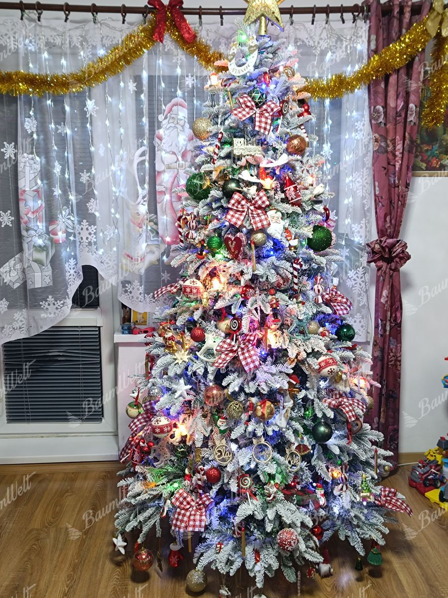 Das Innere des Baumes wird mit klassischen, schneebedeckten PVC-Zweigen ergänzt, was für eine perfekt dichte Baumform sorgt. Bei der Herstellung des Baumes werden PE- und PVC-Materialien höchster Qualität verwendet, so dass er Ihnen jahrzehntelang dienen kann.