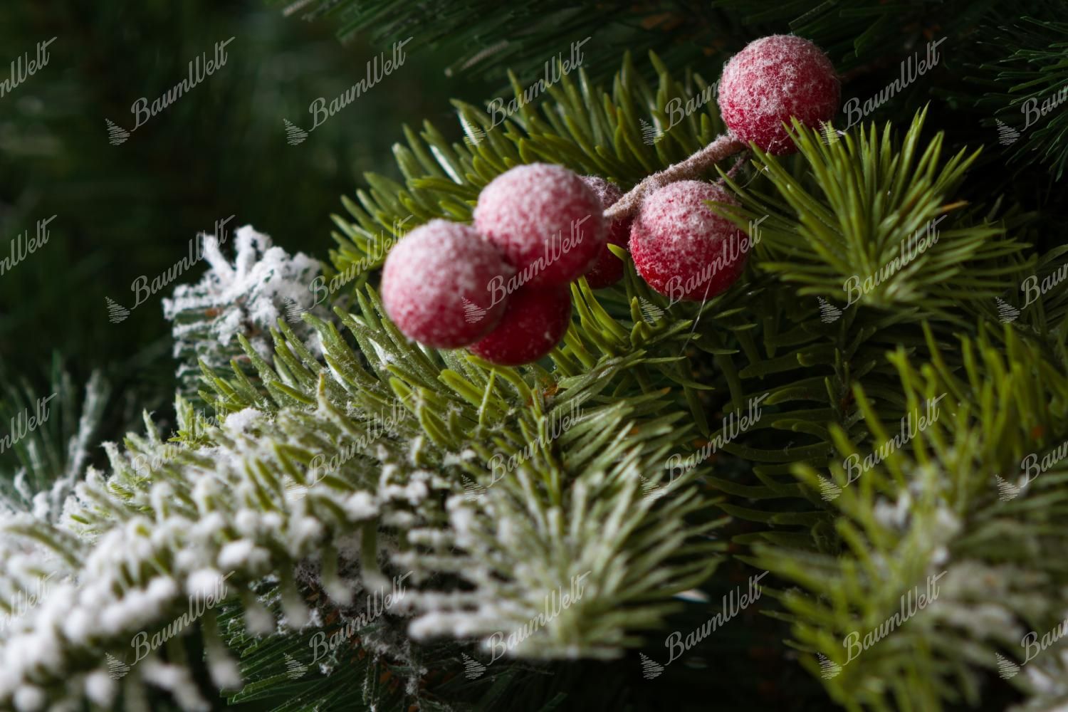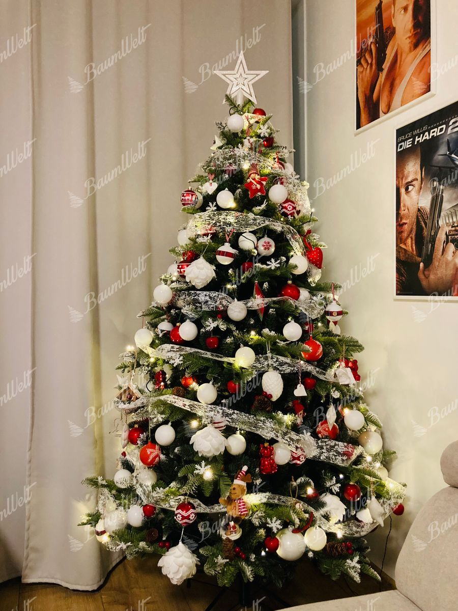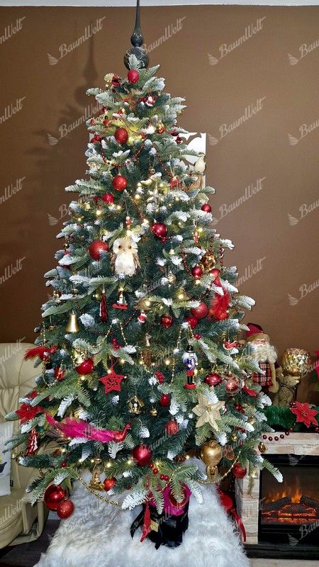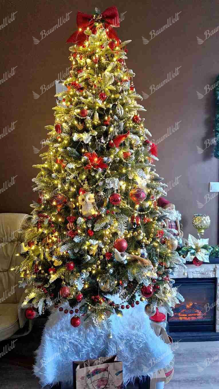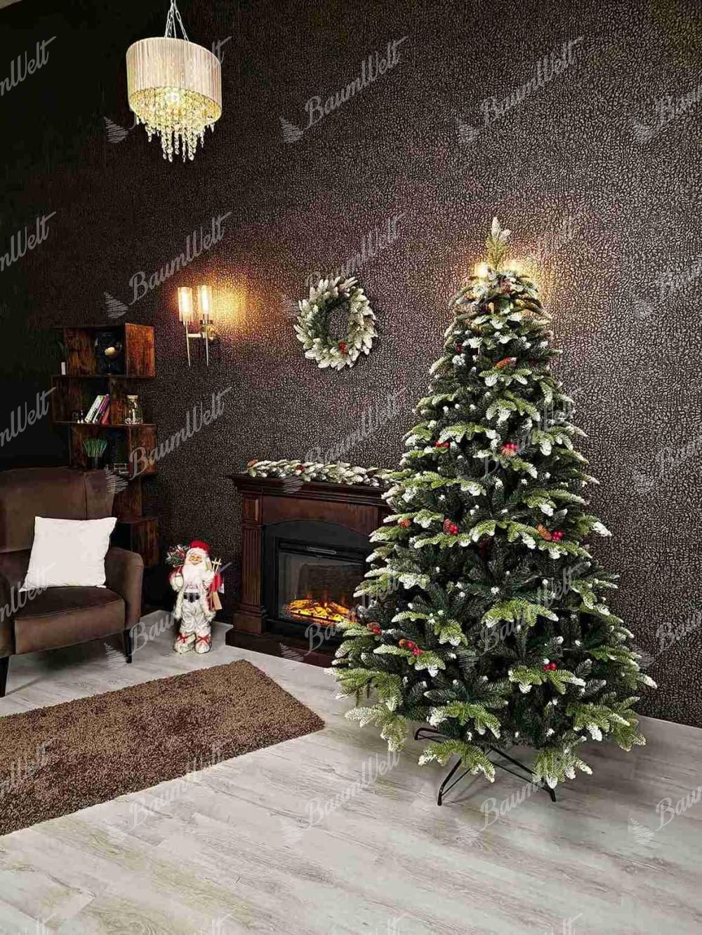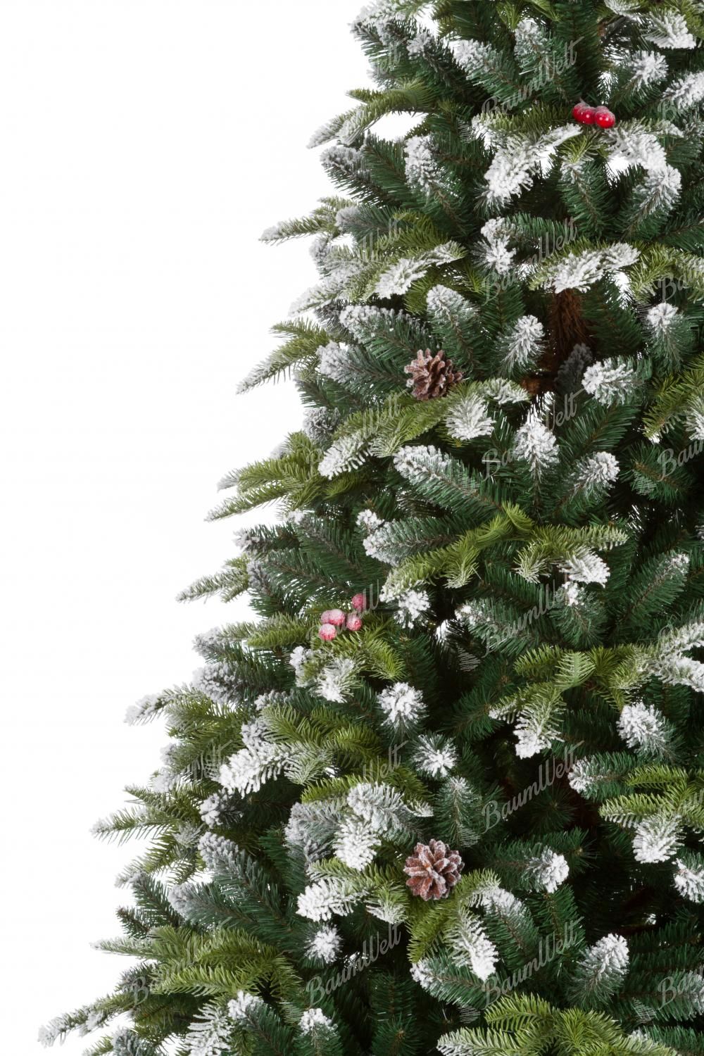 Künstlicher Weihnachtsbaum 3D Tanne mit Kunstschnee zeichnet sich durch dicht verschneite Zweige entlang den Rändern des gesamten Weihnachtsbaumes aus. Die 3D-Nadeln werden durch schneebedeckte Nadelbaumzapfen und Waldbeeren ergänzt, wodurch der Baum ein schönes, traditionelles Aussehen aufweist.