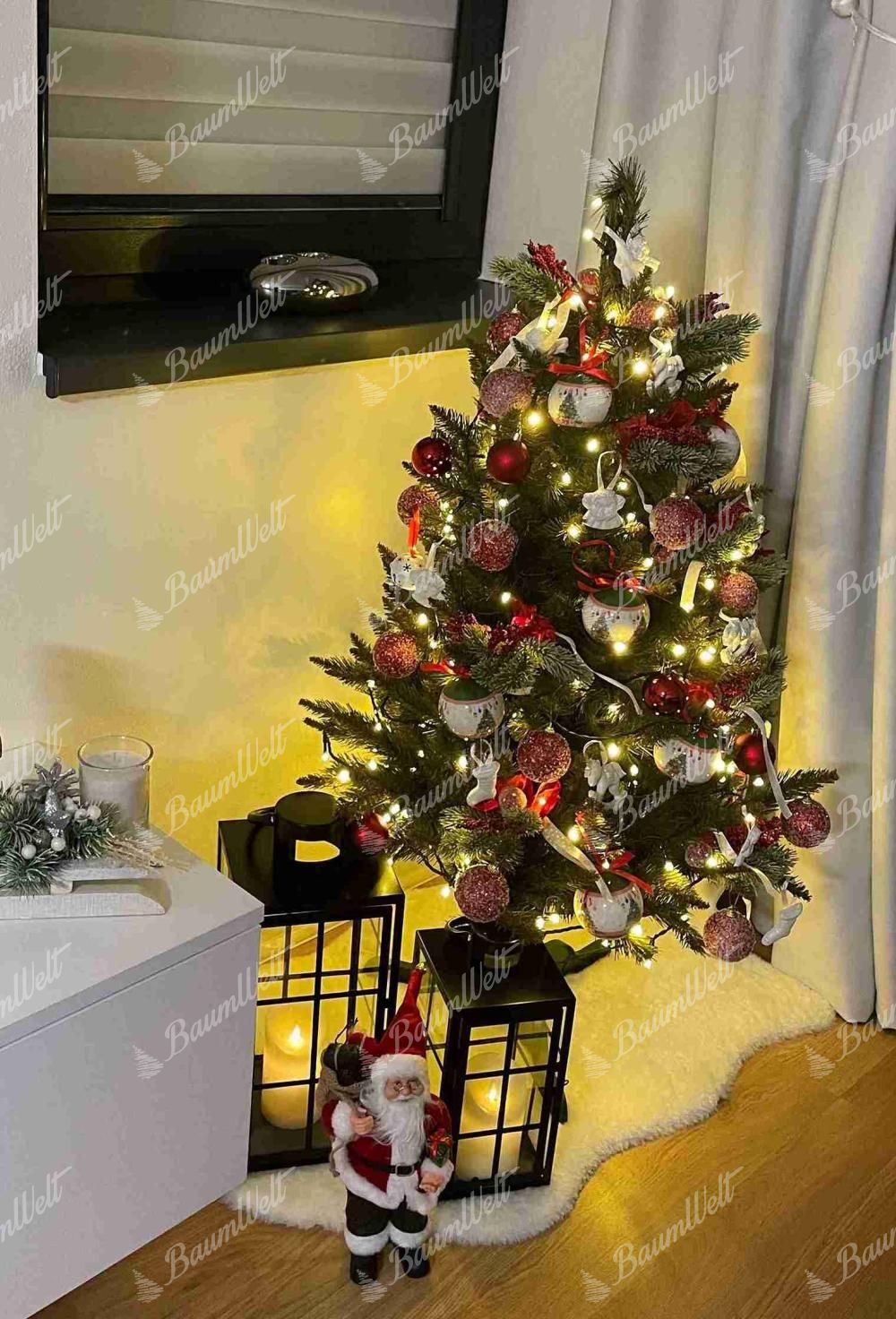Der künstliche Weihnachtsbaum Nordische Fichte zeichnet sich durch schmale PVC-Nadeln und eine große Anzahl von Zweigen aus. Die hochwertige Eisenkonstruktion und ein stabiler Christbaumständer sind Bestandteile der Verpackung.