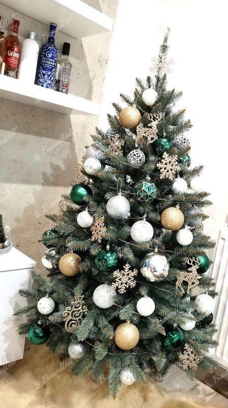 Der künstliche Weihnachtsbaum Silberfichte zeichnet sich durch seine schmalen PVC-Nadeln in türkis-silberner Farbe und einer Vielzahl von Zweigen aus. Hochwertige Eisenkonstruktion und ein stabiler Christbaumständer sind Teil der Verpackung.