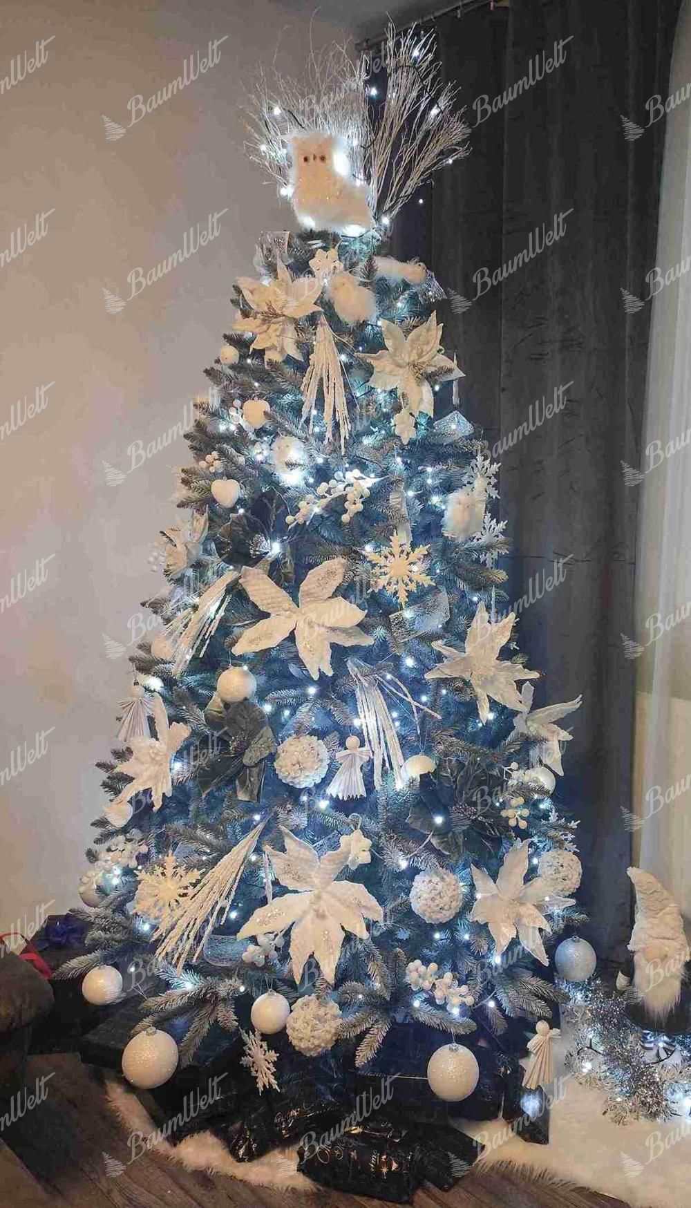Der künstliche Weihnachtsbaum Silberfichte zeichnet sich durch seine schmalen PVC-Nadeln in türkis-silberner Farbe und einer Vielzahl von Zweigen aus. Hochwertige Eisenkonstruktion und ein stabiler Christbaumständer sind Teil der Verpackung.