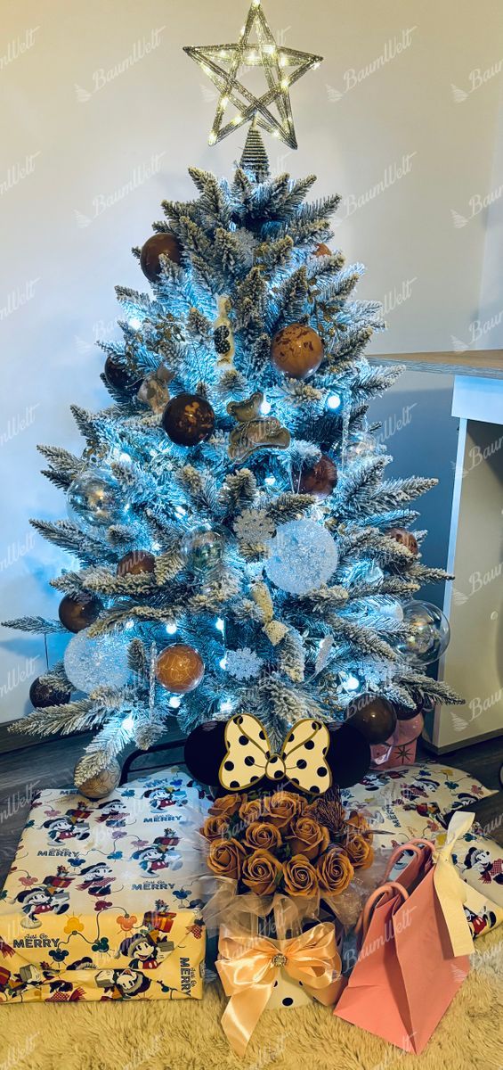 Der moderne, schneebedeckte künstliche Weihnachtsbaum Weiß-Fichte zeichnet sich durch hochwertige, grüne Fichtenzweige aus, die mit einer dicken Schicht der Kunstschnee bedeckt sind.