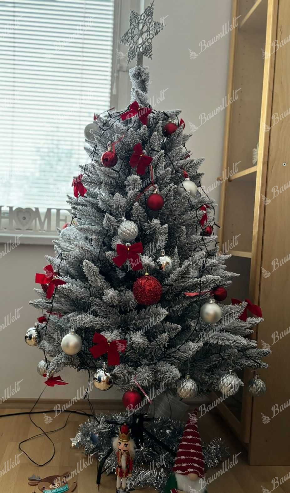 Der Schnee wird mit modernster Technik auf die Zweige aufgebracht, so dass der Schnee kaum vom Baum fällt. Beim ersten Aufstellen des Baums fallen noch unbefestigte Schneepartikel herunter. Der Baum verfügt über eine solide Eisenkonstruktion und einen stabilen Metallständer, der im Lieferumfang enthalten ist.