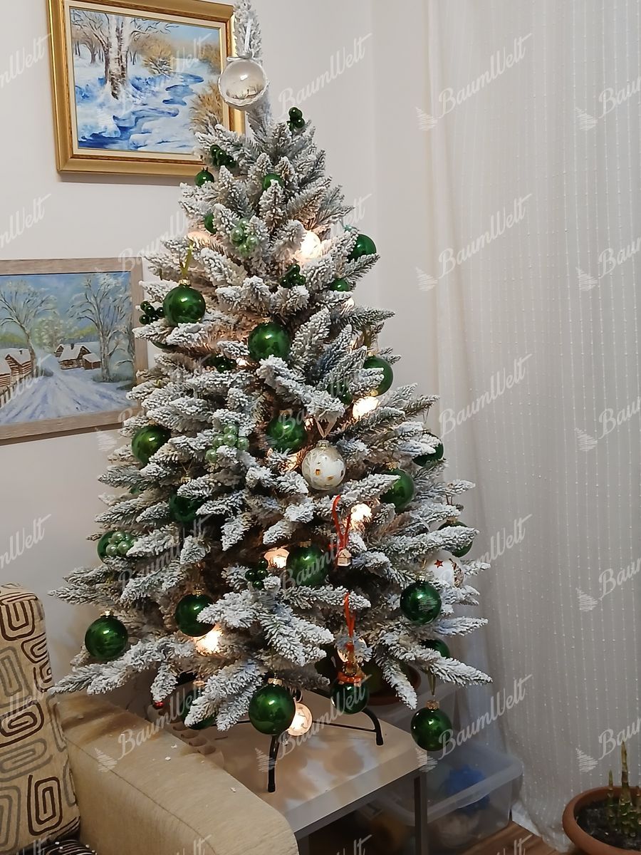 Der moderne, schneebedeckte künstliche Weihnachtsbaum Weiß-Fichte zeichnet sich durch hochwertige, grüne Fichtenzweige aus, die mit einer dicken Schicht der Kunstschnee bedeckt sind.