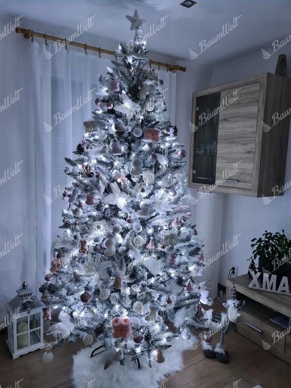 Der moderne, schneebedeckte künstliche Weihnachtsbaum Weiß-Fichte zeichnet sich durch hochwertige, grüne Fichtenzweige aus, die mit einer dicken Schicht der Kunstschnee bedeckt sind.