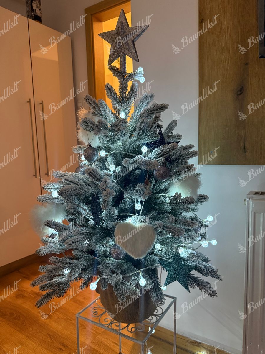 Seine weiß-grünlichen Zweige bezaubern wohl jeden, der sich nach einem eisig majestätischen Weihnachtsfest sehnt. Die 3D-Nadeln werden am gesamten Umfang des Baums durch klassische PVC-Nadeln ergänzt, die dicht zugeschneit sind. Das hochmoderne System zum Aufbringen des  Kunstschnees auf den Baum sorgt dafür, dass der Schnee nicht herunterfällt.