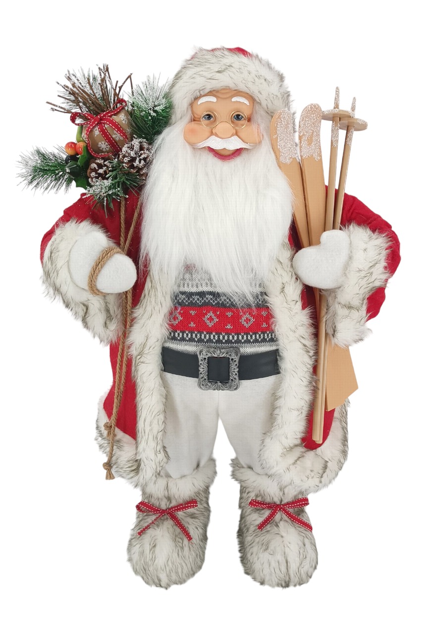 Der rot-weiße St. Nikolaus ist detailreich gestaltet. Sein kunstvolles Gesicht ist mit einer runden Brille und einem dichten weißen Bart geschmückt. In seinen Händen hält er stilvoll abgestimmte Accessoires wie einen Sack mit Geschenken und einen Hausschuh oder Skier.