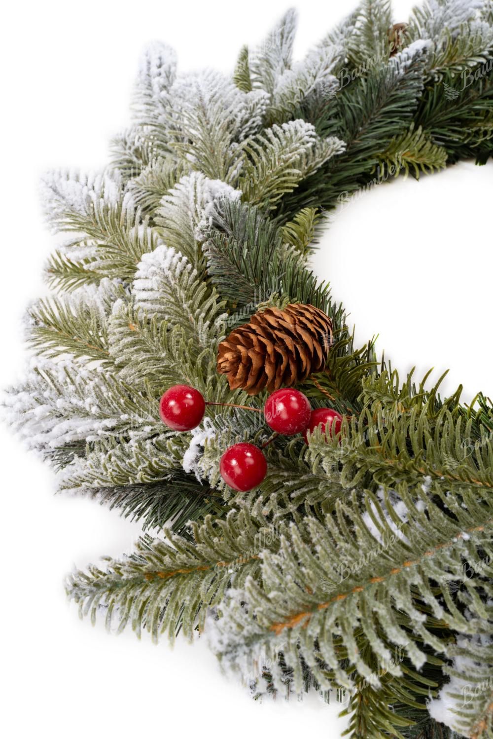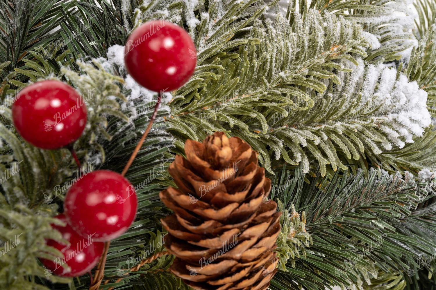Nach dem Vorbild eines unserer meistverkauften Bäume entstand der Weihnachtskranz 3D-Tanne mit Kunstschnee. Dieser Weihnachtskranz besteht aus einer Kombination von PVC- und 3D-Zweigen, die an den Enden dicht beschneit und durch rote Beeren und Nadelbaumzapfen ergänzt werden.