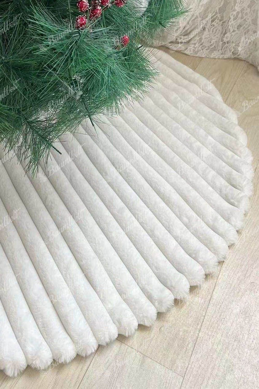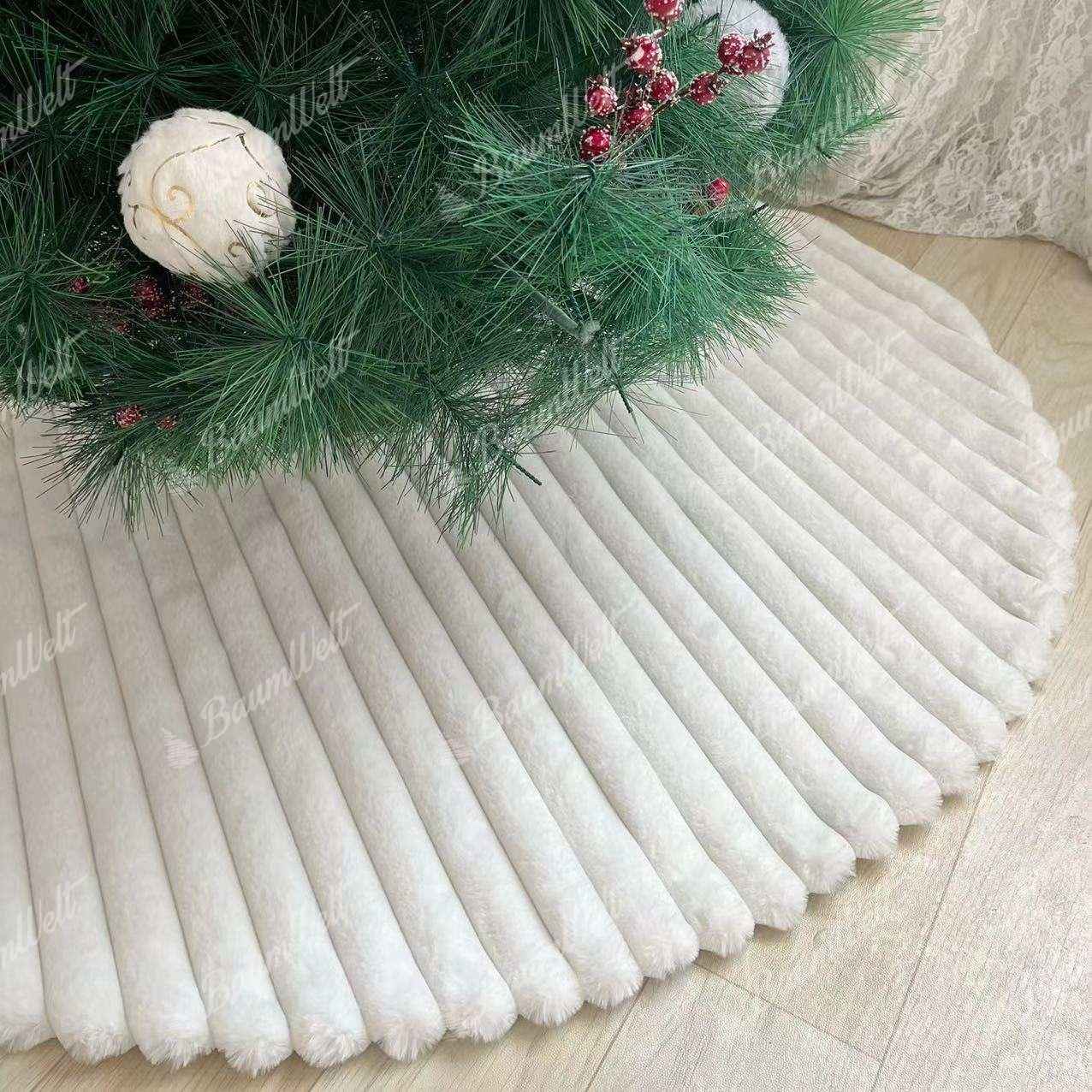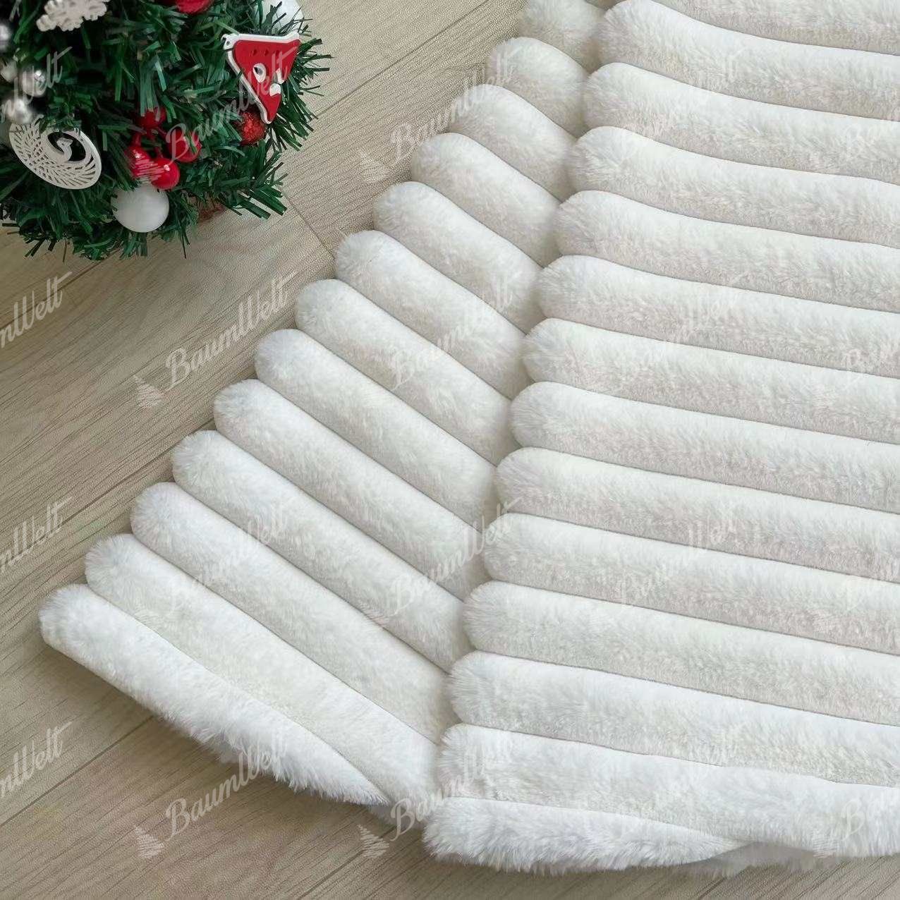 Der weiß gestreifte Weihnachtsbaumrock ist ein tolles Accessoire, um den Weihnachtsbaum zu verschönern und gleichzeitig den Ständer praktisch zu bedecken und die Baumumgebung zu vervollständigen. Er ist aus einem weichen, anschmiegsamen Material gefertigt und mit einem Streifenmuster versehen.