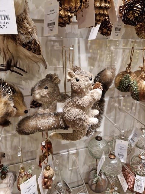 Die Ausstellung war voll von Dekorationen in Form verschiedener Tiere in natürlichen Farbtönen. Realistische Vögel, Igel oder niedliche Eichhörnchen vervollständigen jede natürlich gestimmte Weihnachtsdekoration.